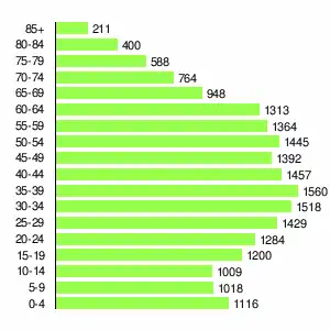 | Жителей | 8680 | 9929 | 13914 | 17766 | 20949 | 23072 | 22401 | 21339 | 20016 |