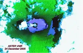 ![]() Активность вулкана Аоба в различных спектрах (2005 г.). Снимок НАСА. | |
