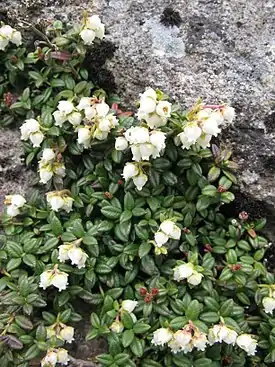 ![]() Растительное сообщество вересковых на горе Хакусан (Хонсю, Япония): арктерика низкая с плодами (внизу слева); Кассиопея плауновидная (Cassiope lycopodioides) (вверху справа) — активно цветущее растение с плауновидными побегами; Филлодоце ниппонская (Phyllodoce nipponica) — растение с побегами, похожими на ёлочки |