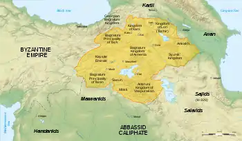 В середине VII века армянские земли были захвачены арабами. В 653 году Армения заключила соглашение с Халифатом, по которому страна переходила в политическую сферу арабов, однако получила полную внутреннюю самостоятельность[134]. Армянский князь Теодорос Рштуни был признан автономным правителем Армении и других районов Закавказья[135]. Позднее в составе Халифата была образована обширная провинция Арминия, со включением также Грузии и Аррана, с центром в армянском городе Двин. В течение VIII—IX веков армяне многократно восставали против арабского ига[131]