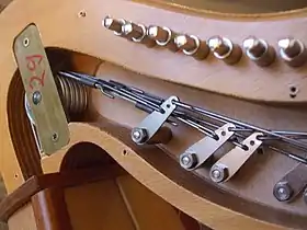 Педальная арфа также имеет главный и педальный механизмы. Обычно имеет 46 струн: 35 синтетических и 11 металлических. Они крепятся к деке снизу арфы и к колкам вверху. Струны ноты До имеют красный цвет, Фа — синий или чёрный[4].