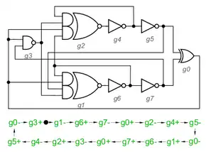 - Асинхронные схемы могут рассматриваться как обобщение кольцевого осциллятора. То есть если выходы схемы соединить через модель внешней среды со входами, схема начнёт осциллировать.