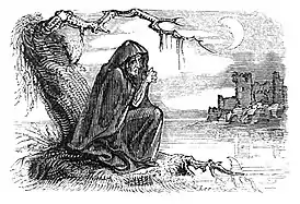 Иногда банши принимает форму сладкоголосой девы, что умерла молодой, а неведомые силы дали ей некое задание стать предвестником гибели своих родных. Или её можно увидеть ночью в виде закутанной в тряпьё женщины, скорчившейся под деревьями, скорбящей с закрытым лицом, или пролетающей в лунном свете, подобно ведьме, при этом горько плачущей. Крик этого духа печальнее всех других звуков на земле и предвещает верную смерть кому-либо из членов семьи всякий раз, когда он слышен в ночной тишине.[9]