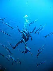Чаще всего их можно видеть большими стаями, где они чувствуют себя чрезвычайно уверенно и на появившихся перед ними аквалангистов не обращают никакого внимания. Следует помнить, что все нападения на людей случались в мутной или тёмной воде, где движущиеся руки или ноги пловца принимались барракудой за плывущих рыб. На Кубе причиной нападения на человека были блестящие предметы, такие как часы, украшения, ножи. Острые зубы барракуды могут повредить артерии и вены конечностей; в этом случае кровотечение надо немедленно остановить, так как потеря крови может быть значительной.