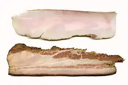 - Челюстный бекон — это солёные и копчёные свиные щеки[17]. Итальянская разновидность челюстного бекона — гуанчале, которая приправляется и вялится, но не коптится.