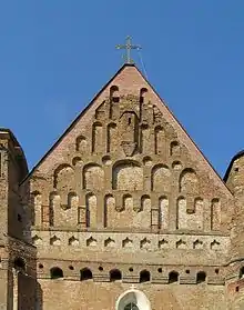 Троицкий костёл в Ишколди на рисунке Эдуарда Павловича, 1848. Под штукатуркой виден цветной ромбовидный орнамент из тычков пережжёного кирпича[11].