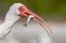 Корм чаще всего добывает на мелководье. Чувствительный клюв позволяет определять пищу с помощью осязания, без визуального контакта. Бродящая по воде птица погружает его в илистый грунт, раскрывает на 1—2 см и водит назад-вперёд, пытаясь нащупать жертву. Длина клюва определяет максимальную глубину, на которой способна найти пропитание птица — обычно она не превышает 15—20 см. Временами ибисы кормятся на суше, на этот раз пользуясь зрением для обнаружения добычи[24][25][26]. Белые ибисы — общественные птицы, кормятся группами и часто образуют смешанные стаи с каравайкой, красным ибисом, американским клювачом, перепончатопалым улитом и другими околоводными птицами. Несмотря на скученность, межвидовая конкуренция невелика, поскольку каждый из перечисленных видов специализируется на определённых видах корма, пересекающихся незначительно. Например, клювач охотится на более крупную добычу (в основном, рыбу)[25], красный ибис в основном на жуков[23], а рацион каравайки более чем наполовину состоит из зерновых культур[27]. Перепончатопалый улит обычно держится позади и добывает ракообразных, насекомых и червей, которых потревожили более крупные птицы. Он также промышляет клептопаразитизмом: отъёмом уже пойманной добычи[28]. В межвидовых группах белый ибис выбирает более мелкий корм, поскольку крупный требует предварительной разделки и легко отбирается кормящимися по соседству цаплями[24][29].