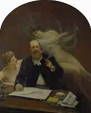 Рядом стоит его картинка совсем другого пошиба: перед лежащим на пригорке молодым человеком в шляпе и пиджаке, курящим беззаботно папироску, дефилируют прямо по воздуху, даже без облаков, современные девы разных характеров и положений: аристократка с лорнетом, гризетка с улыбкой, канканёрша с закинутой на небо ногой и так далее, до простых разносчиц и служанок. Все эти девицы в современных костюмах. А если это не по вкусу иному зрителю, то рядом стоит маленький портретец старичка писателя (Armand Silvestre), курящего и осенённого по плечам двумя голенькими музами. Эта картинка написана особенно старательно. Есть и ещё три портрета, уже без всяких претензий и такой же маленькой величины[24].