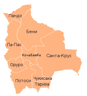 В территориально-административном отношении Боливия разделена на 9 департаментов, каждый из которых, в свою очередь, делится на провинции. Всего существует 98 отдельных муниципалитетов. Согласно новой редакции Конституции, все 9 департаментов являются автономными субъектами[26].