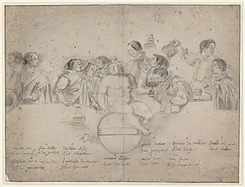 ![]() Аноним. Члены общества «Перелётные птицы» (под № 10 изображён Паулюс Бор — второй справа), 1623 | |