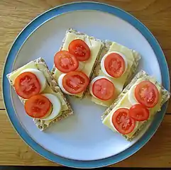 Бутербро́д (от нем. Butterbrot — «хлеб с маслом») — кусочек хлеба или булки с намазанной или уложенной сверху начинкой из какого-либо продукта, готового к употреблению (например масла, сыра, колбасы) или их сочетания[1]. Популярный вид закуски благодаря простоте приготовления, удобству поедания и переноски. Бутерброды не подлежат длительному хранению, так как быстро высыхают, теряя во вкусе и внешнем виде[1].