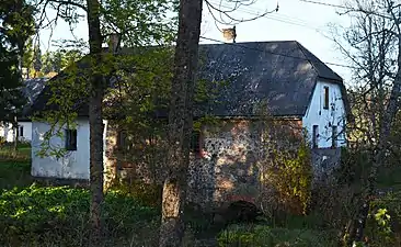 - конюшня. Длинное строение из бутового камня, проёмы которого выложены красным кирпичом, перекрыто высокой полувальмовой крышей. Здание состоит из двух частей; более широкая западная часть, вероятно, старше восточной. В стене восточной части строения есть камень с выбитым на нём годом 1890. В здании в настоящее время работает рукодельная мастерская. При инспектировании 23.04.2021 состояние здания признано удовлетворительным[14];