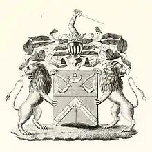 В верхней голубой половине щита, изображены две руки с поднятыми мечами, выходящие из облаков (польский герб Малая Погоня), у боков щита означенных и между ними серебряный полумесяц, рогами обращённый вверх к золотой звезде (польский герб Лелива). В нижней красной половине золотое стропило с двумя стрелами и под стропилом серебряная шпага, остроконечием вниз.