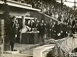 ![]() Вручение Яну Вилсу золотой медали по архитектуре на Олимпийском стадионе (1928) | ![]() Ян Вилс (в центре) возле музея Амстердама после награждения (1928) | |