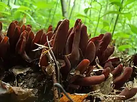 Плодовое тело гриба, называемое апотецией, — толстое, с плотной твёрдой мякотью, которая становится кожистой при высыхании. Грибы прямостоящие, напоминающие по форме заячье ухо, образуют группы, которые могут быть как небольшие, так и многочисленные, растущие из общей ножки, появляющейся из подземного мицелия.