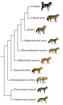Домен: Царство: Подцарство: Без ранга: Без ранга: Тип: Подтип: Инфратип: Надкласс: Клада: Класс: Подкласс: Клада: Инфракласс: Надотряд: Клада: Грандотряд: Отряд: Подотряд: Семейство: Подсемейство: Триба: Canini Подтриба: Canina Род: Вид: Волк |