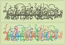 Как орнамент вязь развивается с соблюдением геометрического или природного принципов в конструировании букв - определение их высоты, ширины, толщины начертаний, гибкости линий, а также использование для упоминавшихся декоративных усложнений ломаных петель и в замене косых линий вертикальными. Украшением текста могут служить узелки, усики и тому подобное.