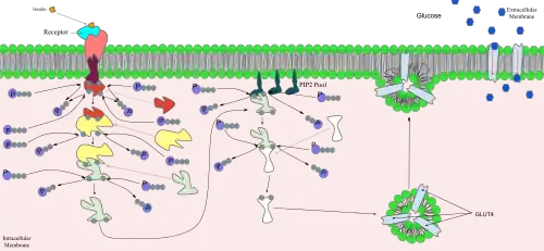 Инсулин связывается с инсулиновым рецептором, который представляет собой тирозиновую протеинкиназу, то есть протеинкиназу, которая фосфорилирует как внутриклеточные домены рецептора по гидроксильной ОН-группе остатков тирозина (происходит так называемое аутофосфорилирование субстрата инсулинового рецептора IRS-1), так и внутриклеточные белки. Аутофосфорилирование субстрата инсулинового рецептора IRS-1 ведёт к усилению первичного сигнала. Эти субстраты образуют комплексы например с фосфоинозитид-3-киназой (ФИ-3-киназа, КФ 2.7.1), точнее с одной из регуляторных субъединиц (p85α), посредством SH2-доменов. Затем субъединица p85α связывается с каталитической субъединицой p110. Активация ФИ-3-киназы является звеном сигнального пути, стимулирующего транслокацию ГЛЮТ-4 из цитоплазмы в плазматическую мембрану, а следовательно — и трансмембранный перенос глюкозы в мышечные и жировые клетки.