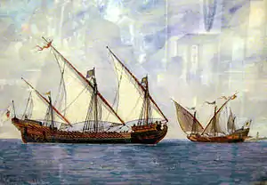 Парусное вооружение, как правило, состояло из двух мачт с латинскими парусами, но имелись галеры и с иным парусным вооружением и числом мачт[18]. Так например, бригантина несла на фок-мачте прямые паруса, а саета — имела три мачты, из которых фок-мачта опять же несла прямые паруса[19].