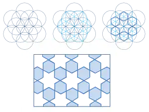 Периодическое замощение плоскости — это регулярное повторение «единичной ячейки» (повторяющейся фигуры или группы фигур) без зазоров. Такие упаковки можно видеть в двумерных кристаллах и вследствие теоремы о кристаллографических ограничениях, единичная ячейка ограничена 2-, 3-, 4- или 6-кратными вращательными симметриями. По этой причине невозможно замостить плоскость периодически фигурами, имеющими пятикратную вращательную симметрию, такими как пятиугольная звезда или десятиугольник. Орнаменты с бесконечными совершенными квазипериодическим порядком переноса могут иметь запрещённые кристаллографией симметрии, какие имеют пятиугольники и десятиугольники. Такие фигуры с пятикратной симметрией повторяются периодически, хотя пространство между ними содержит другие фигуры, которые не имеют периодического орнамента. Такие замощения называются квазикристаллическими[18].