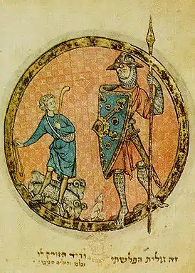 …Выступил и Филистимлянин, идя и приближаясь к Давиду, и оруженосец шёл впереди его… И сказал Филистимлянин Давиду: «Что ты идёшь на меня с палками и камнями? разве я собака?» И сказал Давид: «Нет, но хуже собаки». И проклял Филистимлянин Давида своими богами. И сказал Филистимлянин Давиду: «Подойди ко мне, я отдам тело твоё птицам небесным и зверям земным». А Давид отвечал Филистимлянину: «Ты идёшь против меня с мечом и копьём и щитом, а я иду против тебя во имя Господа Саваофа, Бога воинств Израильских, которые ты поносил; ныне предаст тебя Господь в руку мою, и я убью тебя, и сниму с тебя голову твою, и отдам труп твой и трупы войска Филистимского птицам небесным и зверям земным, и узнает вся земля, что есть Бог в Израиле; и узнает весь этот сонм, что не мечом и копьём спасает Господь, ибо это война Господа, и Он предаст вас в руки наши». Когда Филистимлянин поднялся и начал приближаться навстречу Давиду, Давид поспешно побежал к строю навстречу Филистимлянину. И опустил Давид руку свою в сумку и взял оттуда камень, и бросил из пращи и поразил Филистимлянина в лоб, так, что камень вонзился в лоб его, и он упал лицом на землю, так одолел Давид Филистимлянина пращёю и камнем, и поразил Филистимлянина и убил его; меча же не было в руках Давида. Тогда Давид подбежал и, наступив на Филистимлянина, взял меч его и вынул его из ножен, ударил его и отсёк им голову его; Филистимляне, увидев, что силач их умер, побежали…