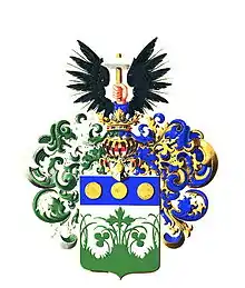 На щите дворянский коронованный шлем. Нашлемник: между двух черных орлиных крыльев кисть правой руки натурального цвета в лазуревый одежде держит серебряный с золотой рукояткой молоток. Намёт на щите справа зелёный, подложенный серебром, слева лазуревый, подложенный золотом.