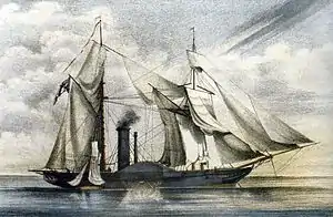 | Движитель | 2 бортовых гребных колеса, паруса |