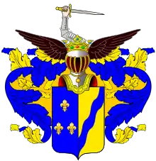 Щит разделён перпендикулярно на две части, из коих в правой, в голубом поле, три золотые Лилии, означенные вверху одна, а внизу две. В левой части в золотом поле, изображена Река, текущая диагонально к правому нижнему углу.