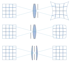 В наименьшей степени дисторсия проявляется у симметричных объективов за счёт расположения диафрагмы между линзами[5]. Под симметрией объектива подразумевается симметрия формы и расположения линз относительно плоскости апертурной диафрагмы, перпендикулярной оптической оси.