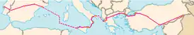 Италия: Мадзара-дель-Валло (Сицилия) — Алькамо — Палермо — Буонфорнелло — Мессина — (переправа через море) — Реджо-ди-Калабрия — Катандзаро — Кротоне — Сибарис — Метапонто — Таранто — Бриндизи —- Паром Италия — Греция