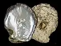 Ископаемый жемчуг — разновидность окаменелостей. Встречается крайне редко; во всем мире насчитывается только лишь несколько сотен ископаемых жемчужин, которые были найдены в породах различного геологического возраста (от триаса до плейстоцена)[29]. Ископаемый жемчуг бывает пресноводным и морским. Первая находка ископаемого пресноводного жемчуга была сделана в 1970 году советско-монгольской геологической экспедицией в пустыне Гоби. Он был найден совместно с раковинами двустворок и в виде отдельных мелких диаметром 2,5 мм сферических, эллипсоидальных и полусферических жемчужин, находящихся в слое перламутра[30]. Особенностью пресноводного ископаемого жемчуга является крупное по величине ядро, составляющего около половины диаметра жемчужины. Цвет перламутрового слоя желтовато-кремовый с разными оттенками.