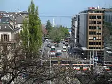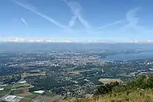Река Рона делит город на две части. На левом берегу Роны исторический центр с собором Святого Петра и готической ратушей, на правом берегу — Дворец Наций и железнодорожный вокзал. Главная достопримечательность — фонтан высотой 147 метров.