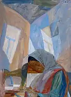 Формируется характерный живописно-пластический язык автора: абстрагирование от натуры, высокая степень обобщения, плоскостность, отсутствие перспективы. Характерен и колорит, чаще всего — приглушенный, сумрачный. В нём, как правило, доминируют серовато-сизые, охристо-коричневые, кирпично-красные тона.