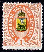 Выпуск собственных земских почтовых марок начался в 1871 году. На марках был изображён герб Псковской губернии.
