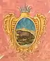 В руке из облака лук с одною стрелою белою, а перо чёрное, в стороне крест красный, поле жёлтое. |