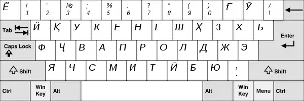 Русские буквы и дополнительные символы доступны по одновременному нажатию и удержанию клавиши AltGr (правый Alt) и соответствующей буквы. Эта раскладка также подходит для туркменского и калмыцкого.