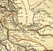 Страбон (Lib,XI. с.10) говорил, что от Гирканскаго моря (Каспийского) к востоку по правую сторону до Индии простираются горы, называемые греками тавром[66][67]. На северной стороне сих гор живут гелы[68] (Gelae) и кадусии[69], слева живут дахи, к востоку массагеты и саки, и прочиe, называемые общим именем скифы.[70] Он также описывал кадусиев[71] как воинственное горное скифское племя гелов[72][73][74][75][76], сражающихся в основном пешком и хорошо владеющих коротким мечом или копьём; они превосходные метатели дротиков; в гористых местах они сражаются вместо всадников[77].