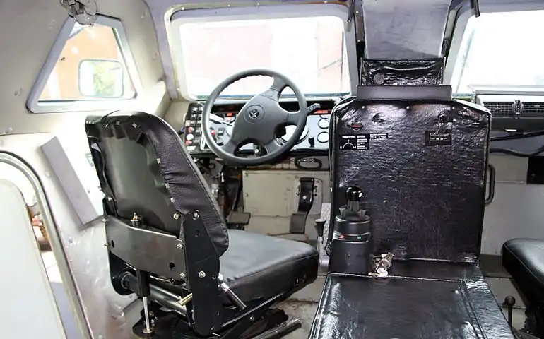 Отчётливо видны: руль, педали, приборная панель в форме торпеды, рычаг переключения коробки передач, рычаги привода стеклоочистителей, указателей поворотов, подачи звукового сигнала (клаксон), спидометр, выключатели отопления и освещения в кабине, фар и грузовой лебёдки, а также другие приборы, тумблеры и индикаторы.