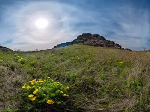 Гранитные обнажения сочетаются с участками целинной степи. Граниты серые и чёрные, розоватые граниты встречаются крайне редко.