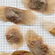 Плод — коробочка, удлинённый двухстворчатый кожистый стручок. Створки при созревании деревянистые, гладкие с редкими разбросанными чешуйками или уплощенными железами. Семена многочисленные, плоские, перепончатые, с полупрозрачными крылышками.[5]