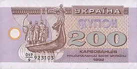 В силу острой нехватки наличной денежной массы (то есть банкнот советских рублей), было решено ввести другие (неотрезные) купоны, которые могли иметь отдельный от банкнот оборот. Номинированные в рублях (на украинском языке рубль — карбованец), именованные как купоны (слово «Купон» указано на лицевой стороне и была сделана шрифтом, очень похожим на шрифт Playboy 1975-го года[11][12]). Эти денежные единицы получили название купоно-карбованцы. В силу того что первоначально купоно-карбованцы не предполагалось использовать как самостоятельную денежную единицу, они имели низкий уровень защиты от подделок (из защиты на них были только водяные знаки) и быстро протирались по сгибам. Номера на выпуске 1991 года отсутствовали, а на выпусках 1992—1993 годов были весьма необычными: номер состоял из дроби (это был номер замещения купюры) и обычного номера, а буквенной серии там не было вообще. Выпуски 1994—1996 годов имели уже буквенно-цифровую нумерацию.