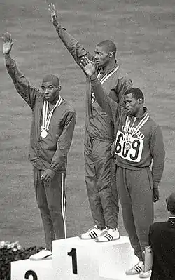 ![]() Пол Дрэйтон, Генри Карр и Эдвин Робертс на олимпийском пьедестале Токио (1964) | ||||||||||||||
