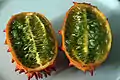 Плод кивано — жёлтого, оранжевого или красного цвета с несъедобной жёсткой кожистой кожурой, покрытой мягкими шипами. Имеет зелёную, похожую на желе мякоть с бледно-зелёными семенами. Длина плода — до 15 см. Семена белые, многочисленные, длиной до 1 см.[3]