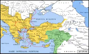 В 268 году ситуация в Римской империи ухудшилась[23]. Готы вторглись в Мезию и Фракию, были осаждены Фессалоники. Ещё в 267 году герулы начали морское вторжение в причерноморские поселения, захватив Византий, но потерпели неудачу при набеге на вифинское побережье. Это заставило их отправиться на запад и пересечь Эгейское море, чтобы напасть на богатые, но плохо защищённые земли Греции. По дороге они разграбили острова Лемнос и Скирос, высадились в Аттике, где разорили Афины. Затем герулы прошли через Истмийский перешеек, недостроенные укрепления которого не смогли их остановить. Коринф, Спарта и Аргос были полностью разграблены. Затем захватчики направились в Беотию. Здесь они столкнулись с крупной римской армией под командованием Марциана. Однако его сил было недостаточно, чтобы полностью остановить противника, но зимой ему удалось отогнать герулов на север в Эпир и Македонию к Галлиену, который выступил из северной Италии. Наконец, весной 268 года в долине Нессоса (или Неста) на границе между Македонией и Фракией Галлиен одержал победу над варварами. С вождём герулов Навлобатом император пришёл к соглашению, предоставив ему право отступить за пределы империи. В этот момент Галлиену пришла весть, что его военачальник Авреол поднял мятеж в северной Италии. Галлиен сразу оценил серьёзность ситуации: если он потеряет контроль над этим регионом, то его положение станет безнадёжным. Оставив Марциана оборонять дунайскую границу, цезарь собрал большую армию и отправился в Италию для борьбы с новой угрозой[24][25].