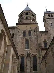 Длина базилики составляла 187 м, высота — 30 метров, что делало её самой большой церковью Европы вплоть до строительства Собора Святого Петра. Базилика была пятинефной; центральный неф был крупнейшим по высоте (30 м) среди романских храмов, ширина его составляла 15 м. К западной части здания примыкал длинный трёхнефный нартекс. Базилика имела два трансепта (главный и придвинутый к алтарной части меньший) и большие хоры; главная апсида храма имела обход — деамбулаторий, который опоясывали малые апсиды (апсидолы). Малые апсиды также дополняли трансепты с восточной их стороны[6]. Широкий центральный неф был перекрыт цилиндрическим сводом. При сооружении свода строители применили новаторский приём, получивший впоследствии большое распространение в европейской храмовой архитектуре: своду с целью погашения бокового распора была придана стрельчатая форма[1][4]. Аркады малых нефов также получили стрельчатые очертания. В стенах были прорезаны большие оконные проёмы. Церковь украшали пять башен — одна на средокрестье, две симметрично расположенные на главном фасаде, а также две над большим трансептом. К внешним стенам храма были пристроены контрфорсы, которые впоследствии широко применялись в готической архитектуре. Готический портал собора — самая новая часть храма — был богато украшен аллегорическими скульптурами[7].