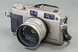Малоформатные фотоаппараты Contax G1 и Contax G2, выпущенные соответственно в 1994 и 1996 годах, стали одними из самых оснащённых в мире дальномерных камер[50]. Оригинальная система автофокуса этих фотоаппаратов основана на сравнении изображений, получаемых через два разнесённых окна по принципу оптического дальномера. При этом фокусировка сменных объективов может быть как автоматической, так и ручной по электронной индикации в видоискателе. Фотоаппараты оснащены современной системой автоматического управления экспозицией на основе TTL-экспонометра, пригодной как для регулировки непрерывного, так и импульсного освещения. При необходимости возможен переход к ручному управлению любыми параметрами[51]. Кроме того, в фотоаппарат встроен скоростной электропривод для взвода фокального затвора и перемещения плёнки, а также для её обратной перемотки в кассету с DX-кодированием светочувствительности. Ручной взвод отсутствует и без батарей фотоаппараты неработоспособны.