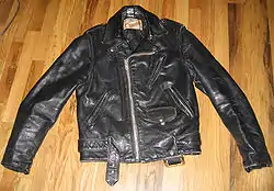 Первая мотоциклетная куртка с косым воротом (косуха) появилась в 1928 году.[1] Сделал её один из братьев основателей фирмы Schott Ирвин Шот[2]. Причиной такого расположения застежки послужили только появившиеся не особо качественные молнии того времени. Для того чтобы снизить нагрузку на механизм, было принято решение создать куртку подобного кроя.[3] Братья были первыми, кто установил на кожаную куртку застёжку-молнию.
