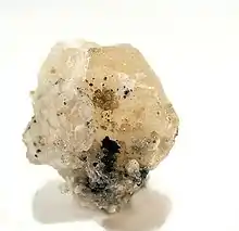 Кристаллизуется в моноклинной сингонии; кубовидные кристаллы и двойниковые пластины встречаются редко. Обычно образует бесцветные, белые или серые кристаллические скопления со стеклянным блеском, часто заключают в себе кварц, сидерит, пирит, галенит, халькопирит, колумбит, касситерит. Возможна окраска примесями органических веществ[1].