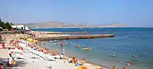 Берега аккумулятивно выровнены. Протяжённость береговой линии 980 км, из них 76 % — абразионные берега (то есть где под действием волн разрушались скалы)[13]. Крупнейшие заливы на побережье Чёрного моря: Каркинитский, Каламитский, Феодосийский. На побережье Азовского: Сиваш, Казантипский и Арабатский. На востоке Крыма находится Керченский полуостров, на западе —Тарханкутский полуостров, на юге — Гераклейский полуостров, на севере — Тюп-Тархан.