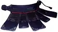 Защитная экипировка надевается для защиты определённых зон на голове, руках и теле. Голова защищается стилизованным шлемом, называемым (яп. мэн), с металлической решёткой (яп. 面金 мэн-ганэ) для защиты лица, с серией жёстких кожаных и тканевых клапанов (яп. 突垂れ цуки-дарэ) для защиты горла и с подбитыми тканевыми щитками (яп. 面垂れ мэн-дарэ) для защиты шеи и плеч. Предплечья, запястья и кисти рук защищены длинными, толстыми тканевыми перчатками, называемыми (яп. 小手 котэ). Торс защищён нагрудником (яп. до), а область талии и паха защищена (яп. 垂れ тарэ), состоящей из пяти толстых вертикальных тканевых лоскутов или фалдов.